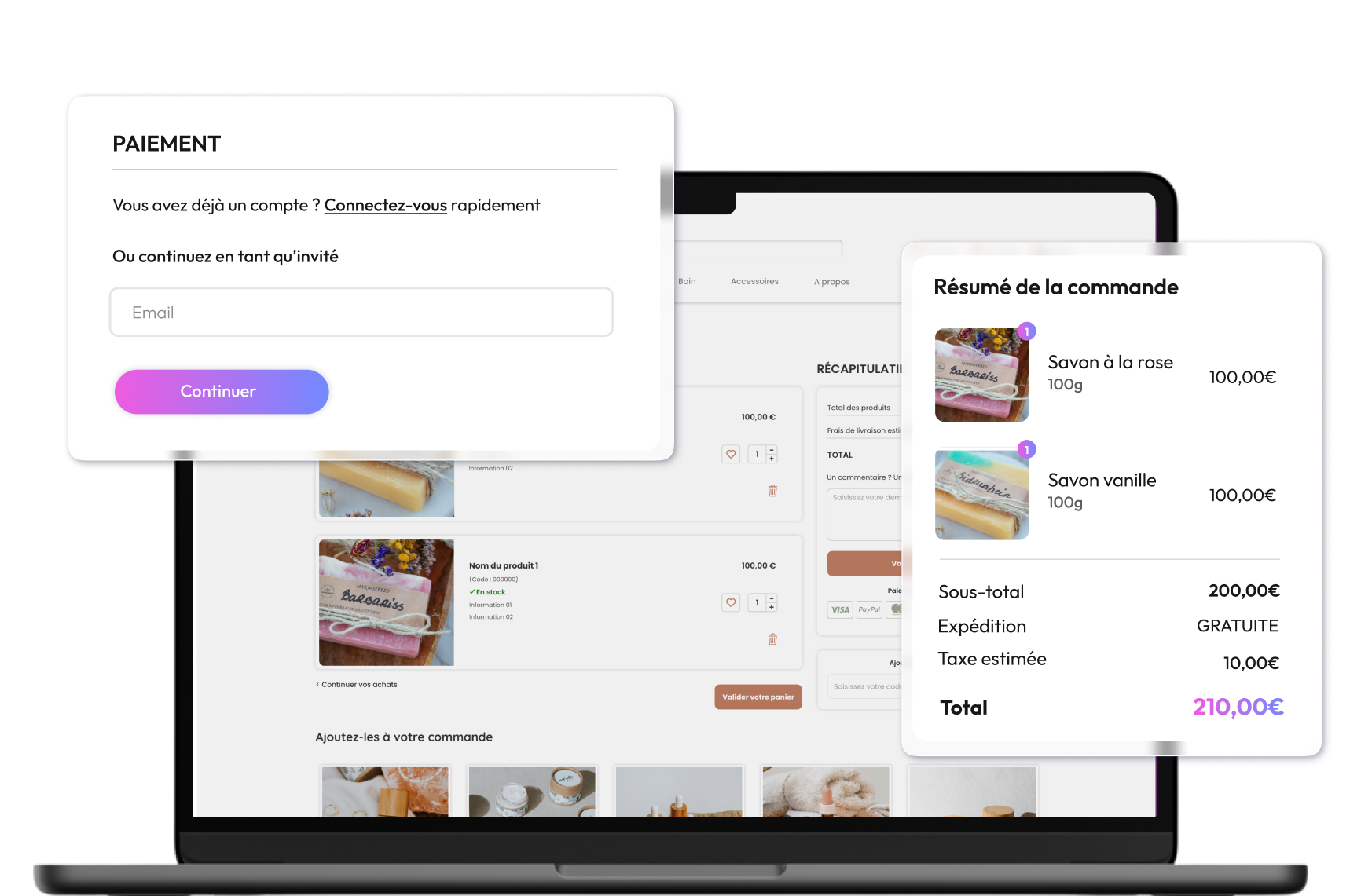 Offrez un tunnel d’achat ultra-rapide en permettant à vos clients de finaliser leur commande sans création de compte. Idéal pour les acheteurs impulsifs et les passages rapides.